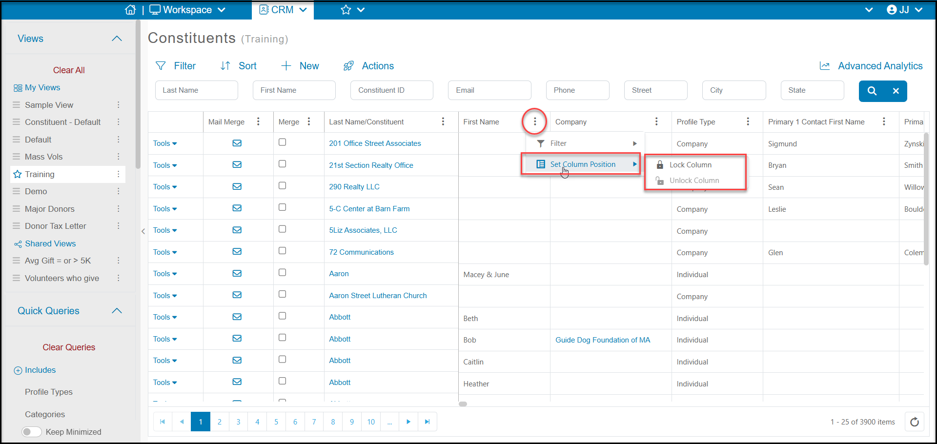 You can also used the Edit Column Settings to add filters or lock a column to the left side of the grid. You can access these options by clicking on the three dots that appear next to every column title on the grid.