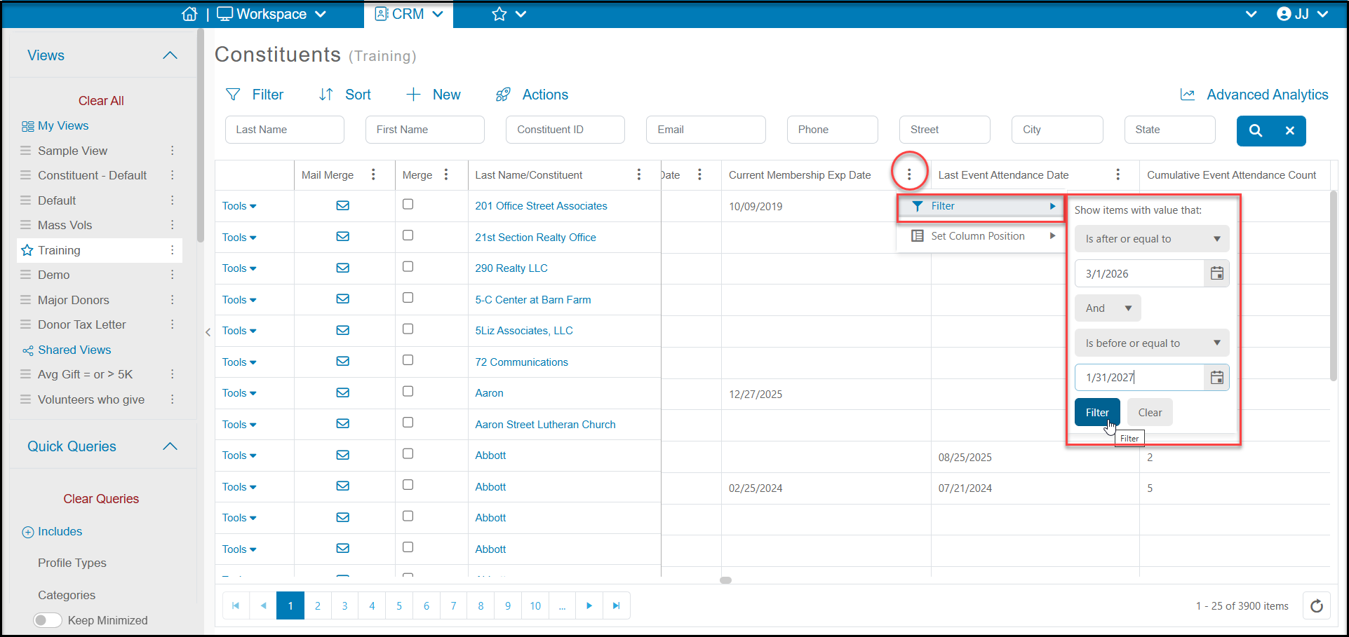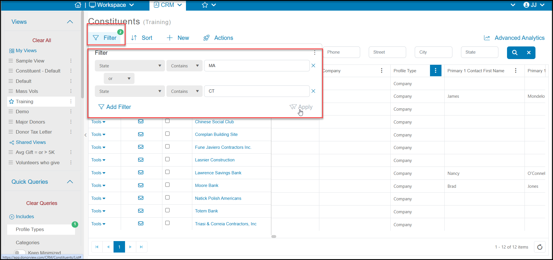 Filters and Sorts are applied in the order they are entered, so entering them in the correct order is important to get the correct information. You can make filters additive using "And" between the filters, so that the results will include only those that meet all the criteria. Or you can make the filters inclusive using "Or" between the filters. In the example below, you are searching for constituents in the state of Massachusetts or Connecticut.