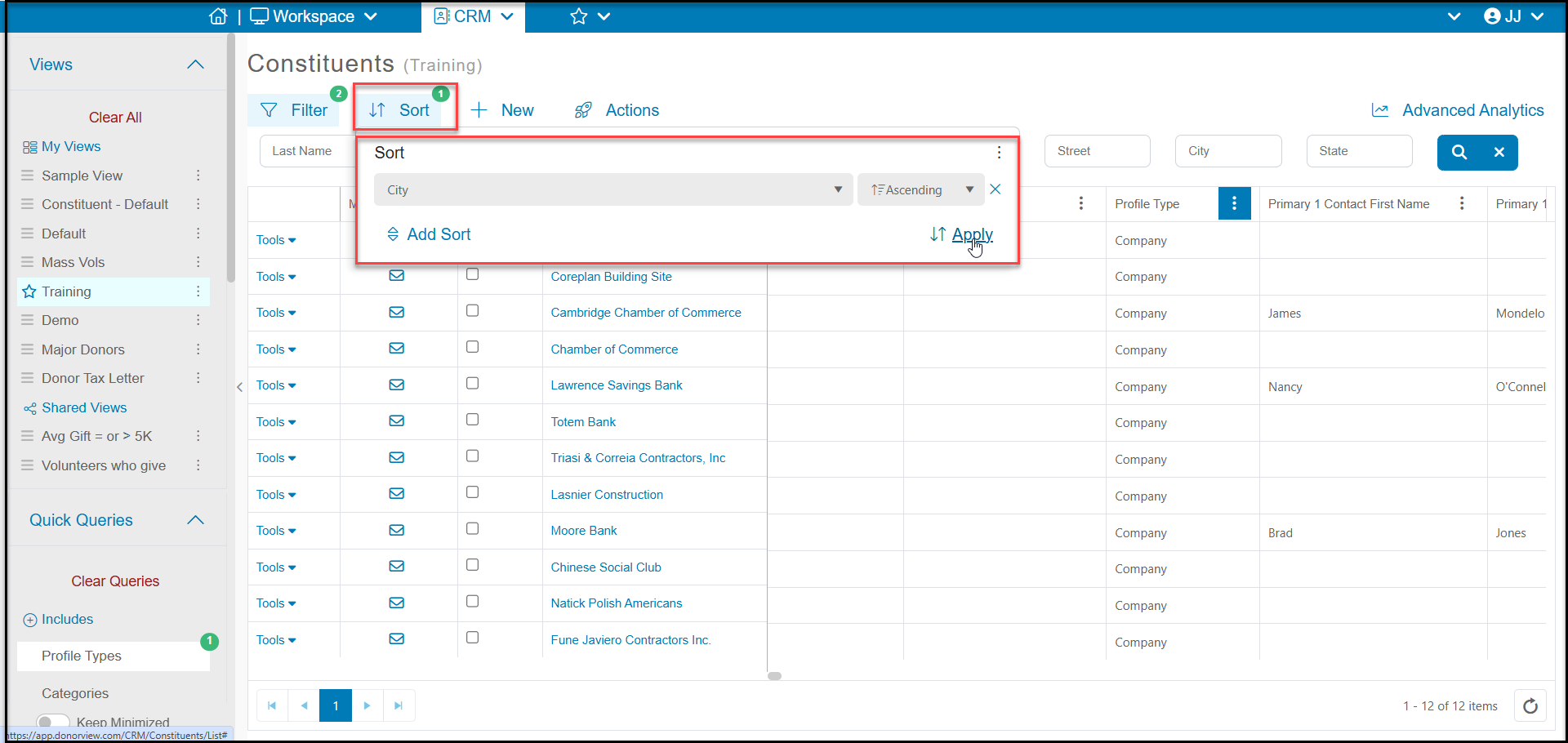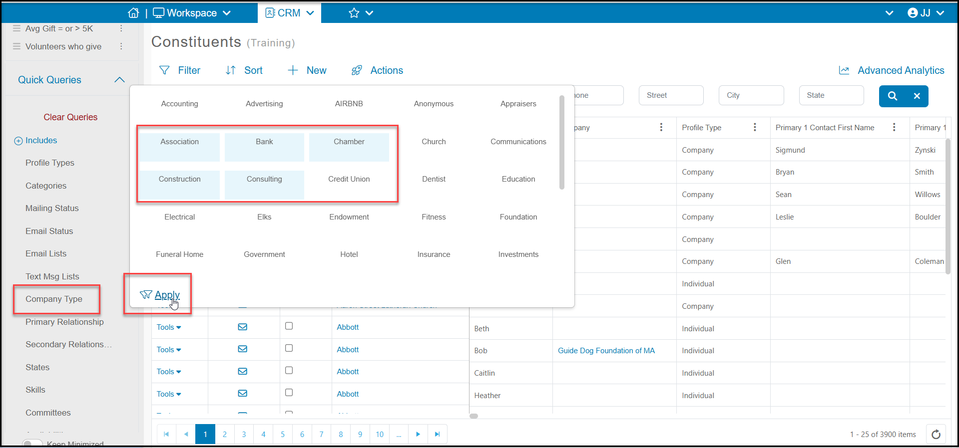 You can also apply filters from the Quick Queries sidebar. Quick Queries allow you to access multi-select fields like Categories and Email Lists, which do not have a column on the grid. They also allow you to make multiple selections at once. In the example below, constituents could be any of the selected Company Types to be included in the list so the view will show all company records assigned to a company type of Associations, Banks, Chambers, Construction or Consulting.