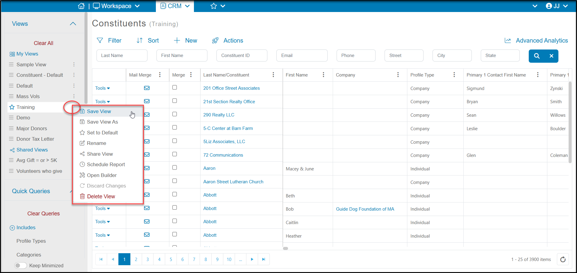 To save a view click on the three-dot menu next to the highlighted view shown under the sidebar View menu. In that menu select Save View As to create a brand-new view. Or, to apply those updated filters and sorts to an existing view you can click Save View to make those changes permanent. You can have as many views as you like and can select which view you prefer to be your default by selecting Set to Default.