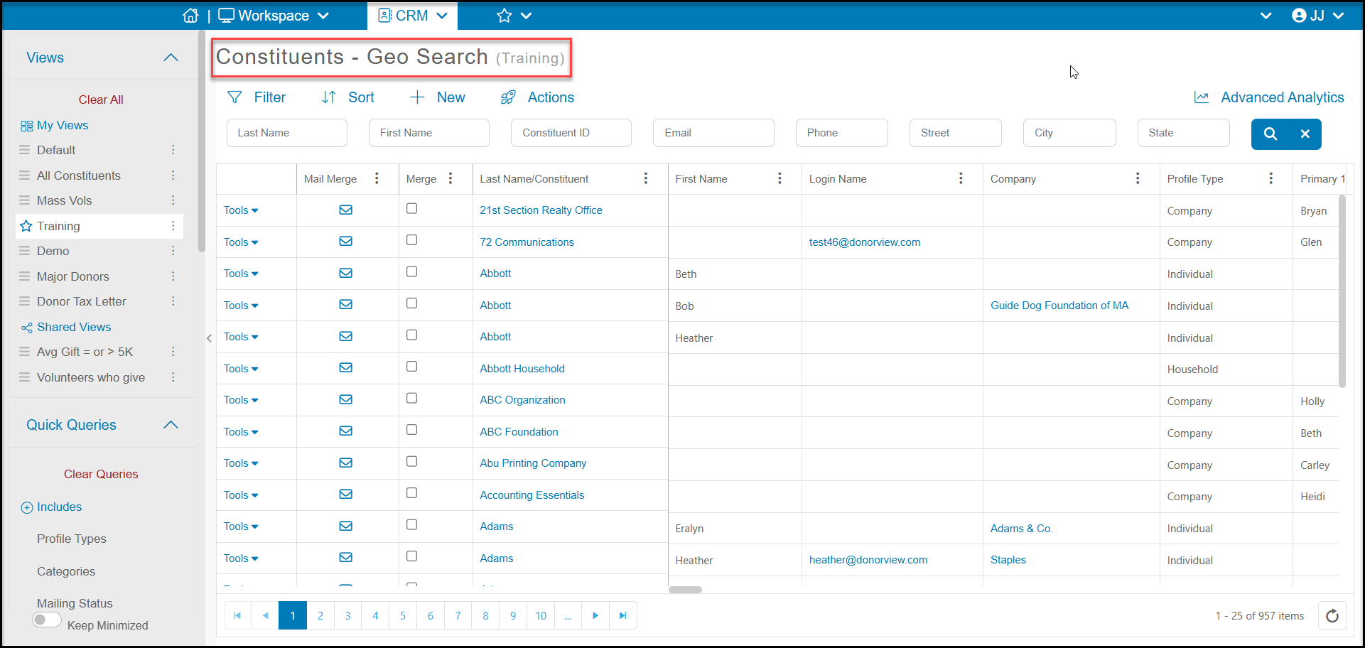 - Geo Search filters cannot be saved as Views, but you can use the Actions menu to export to Excel, generate email lists, send texts, emails, and letters, or perform batch updates to the data shown on the grid.