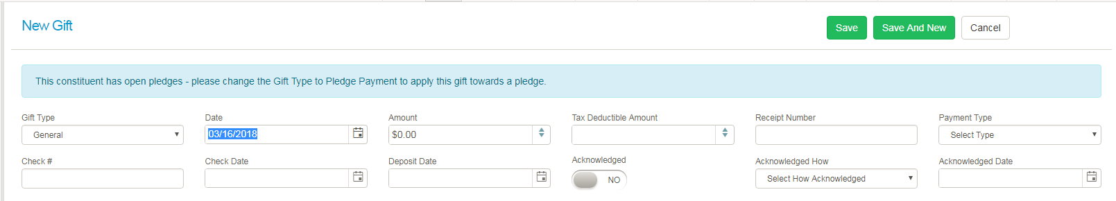 To enter a pledge payment, add a new gift from the Constituents Grid in the CRM Module, the Gifts Grid in the Fundraising Module, or from the constituent's record under their Gift Tab. From the New Gift Screen, select Pledge Payment as the gift type. Once Pledge Payment is selected, the screen will update and show the pledges in the drop down menu under Pledges. Be sure to select the correct pledge to pay, then enter the date, payment amount, and other information as needed. When finished enter the information, click on the green Save or Save and New buttons at the top or bottom of the page to complete the transaction.