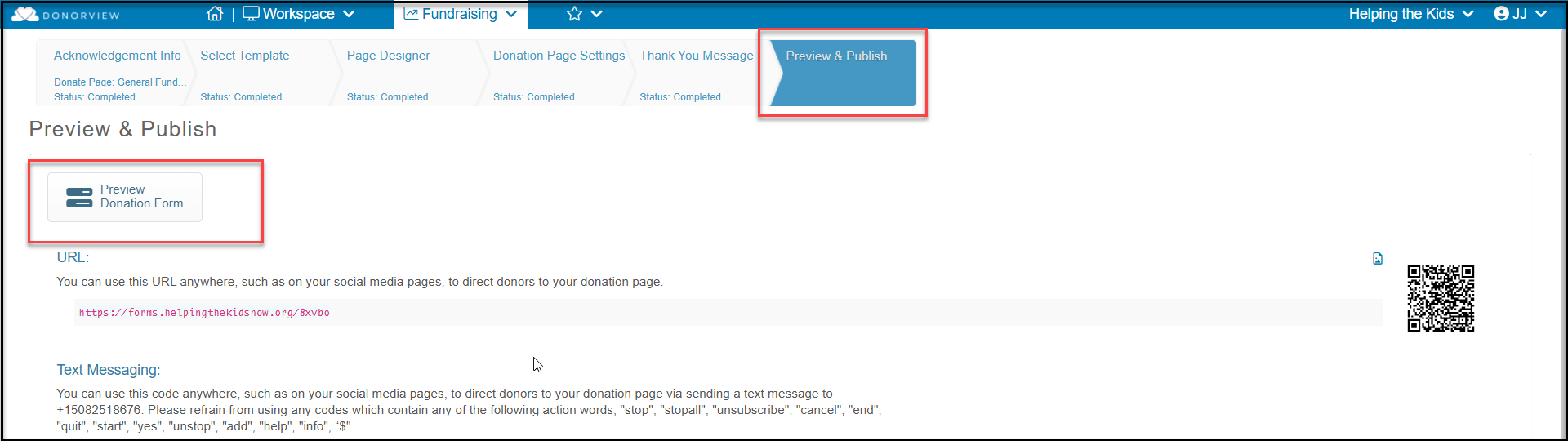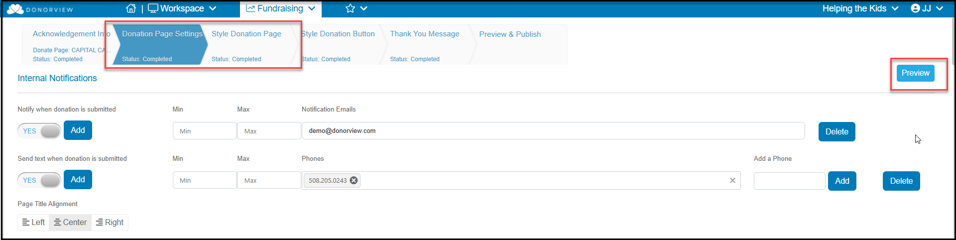 Using the Simple page designer, you can also see a Preview via a link at the top of the Donation Page Settings tab. You can also see a preview on the Style Donation Page tab.