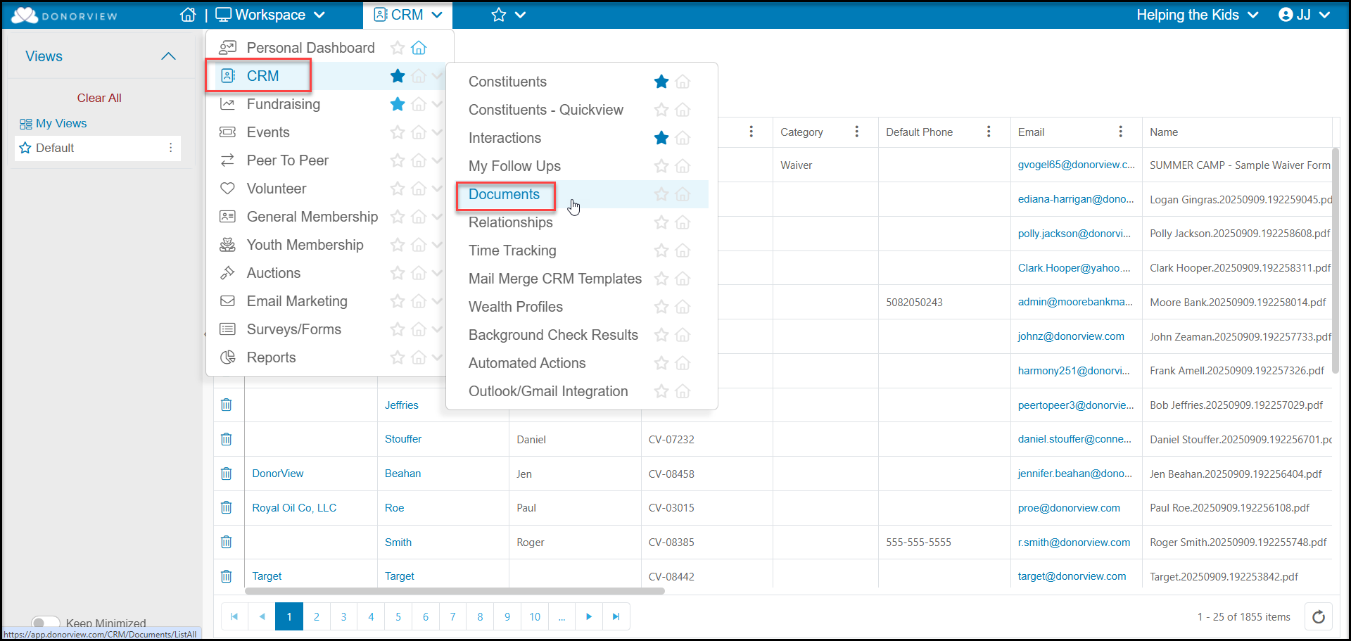 The Documents grid is located in the CRM module and can show a list of all documents for all constituents.This grid works similarly to other grids where you can create custom views by applying filters to the columns on the grid.