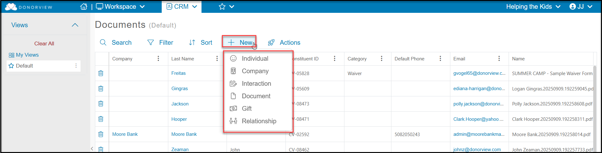 This grid also allows you to upload a new document for a constituent using the +New menu. You can also add new constituents, interactions, gifts and relationships from this menu.