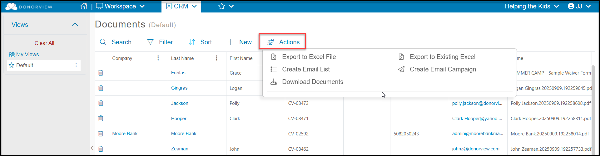 The Actions menu allows you to Export to Excel File, Export to Existing Excel, Create Email Lists and Campaigns, as well as download documents in batches. You can apply a filter to the grid to see specific constituents and click Download Documents to create a zip file containing all the documents for all constituents in your view.