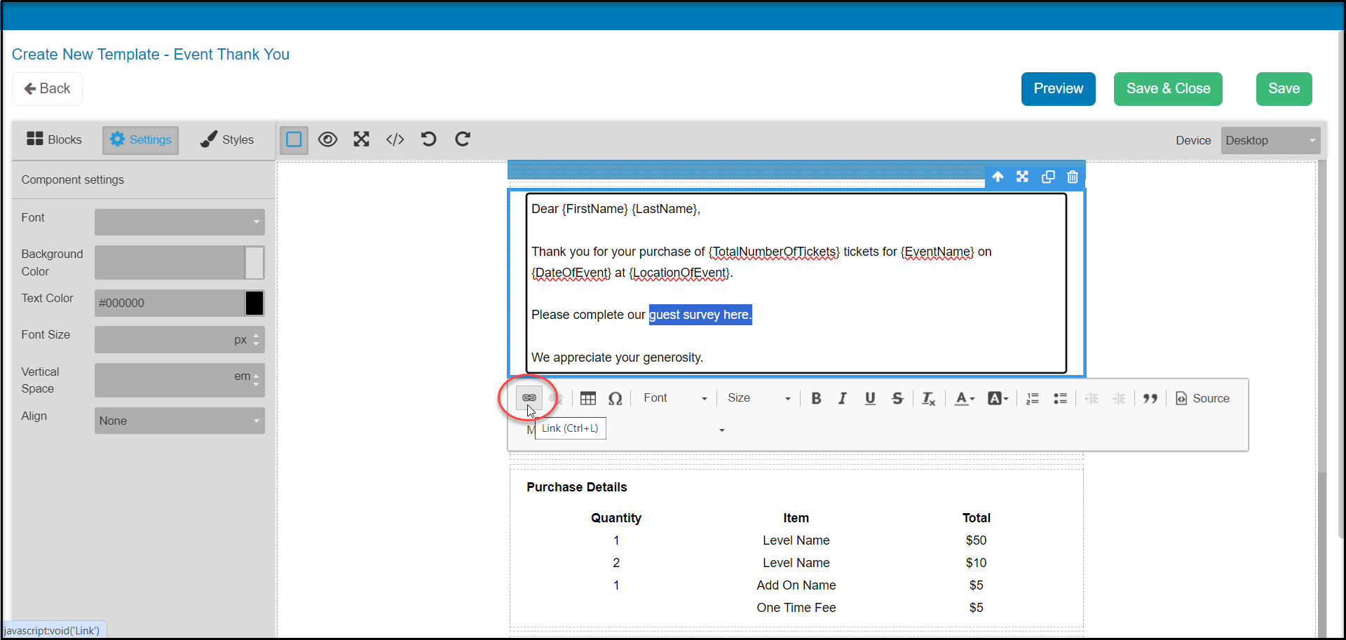 Open your thank you message in the email template editor. You can add the link as a hyperlink in text or as a button. For a hyperlink in text, double click on the text box to edit. Highlight the text to insert the hyperlink and click on the hyperlink icon.