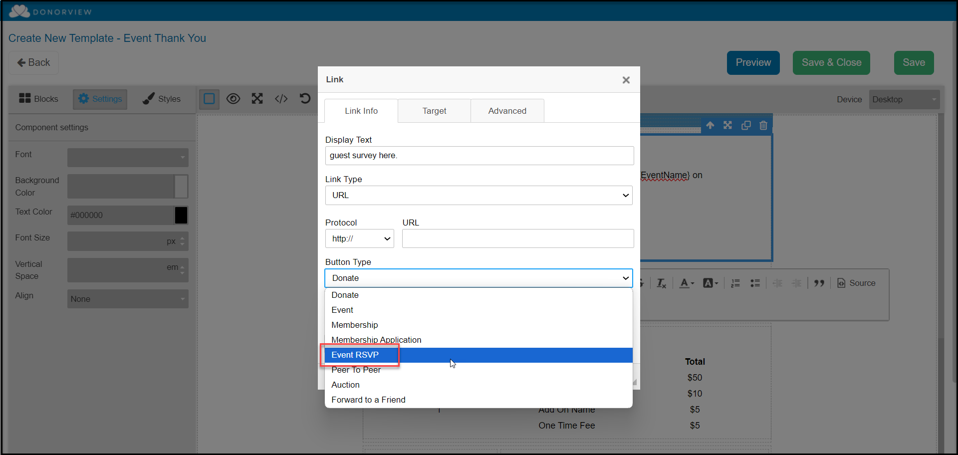 This will launch a new dialog box. Click on the Button Type dropdown towards the bottom dialog and select Event RSVP from the picklist.