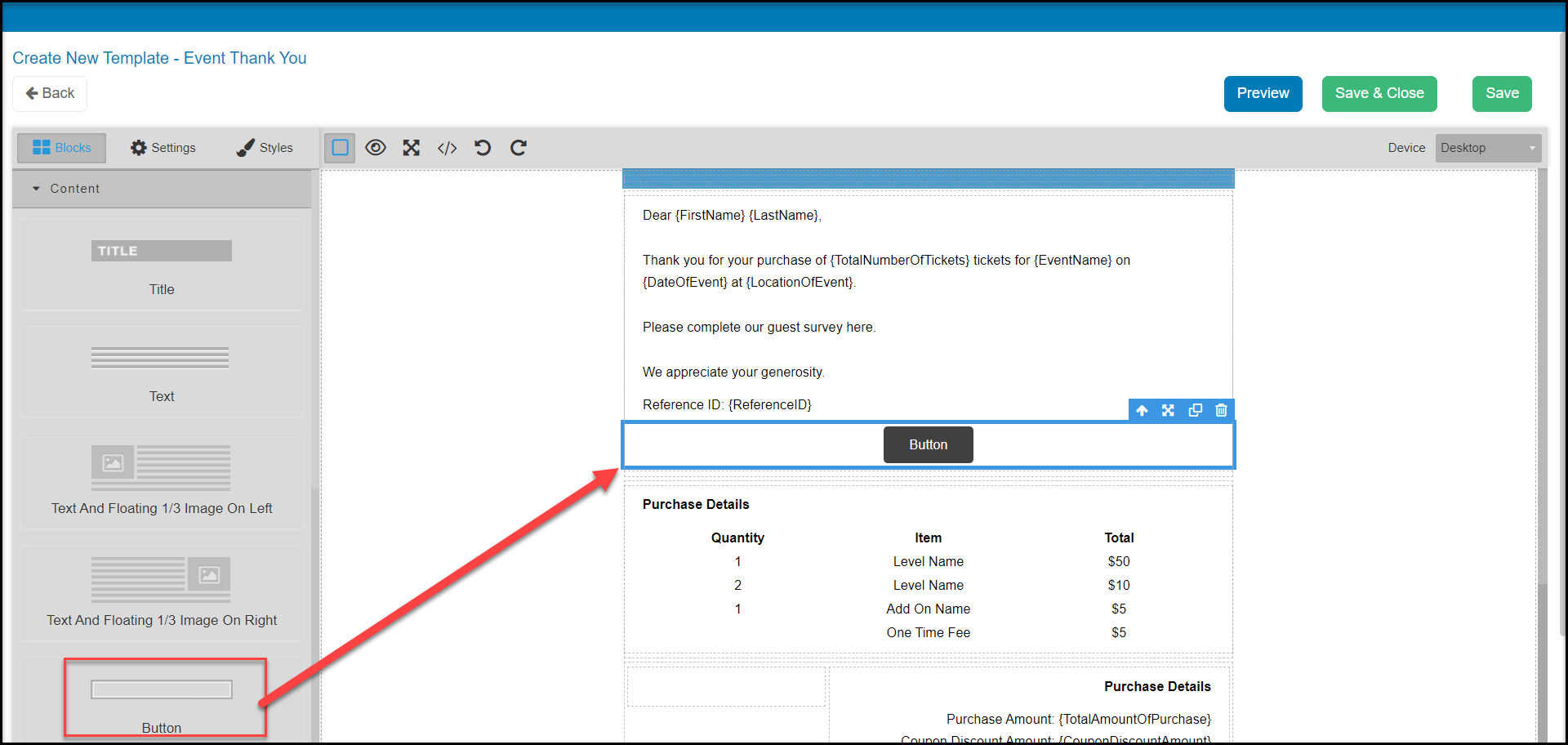 Next under Buttons, select the event. It will only show events which have a guest survey activated.