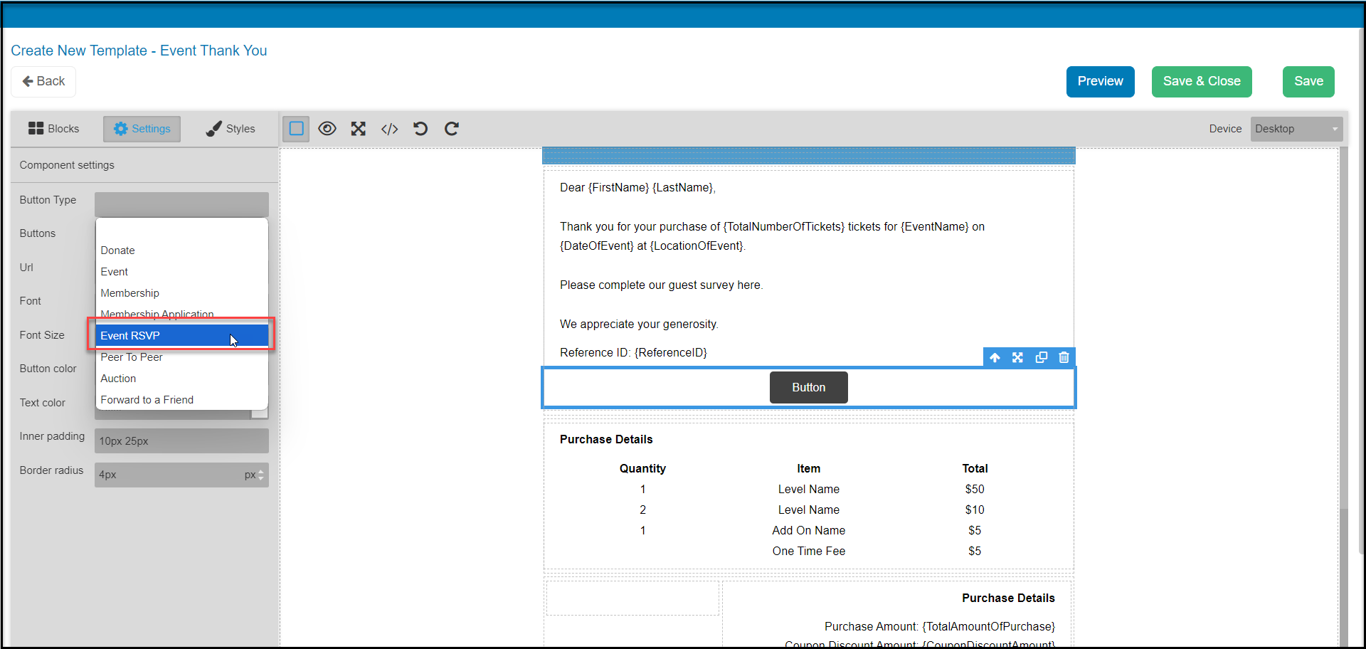 If you choose to insert of button using the Content, you will using the settings to choose the Event RSVP for the button link.