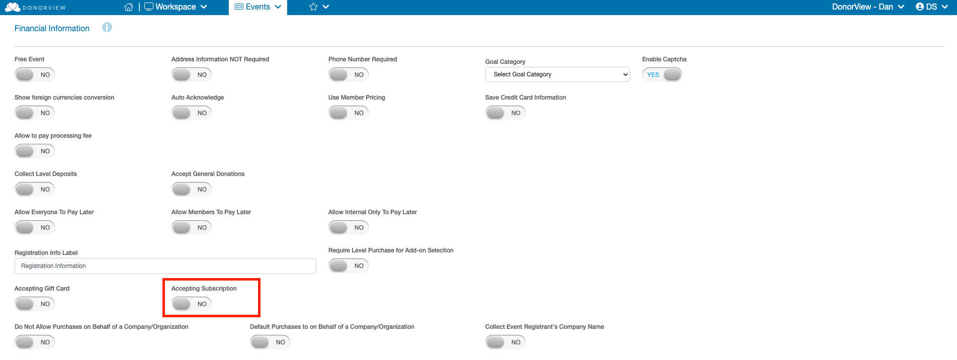 Complete the Financial Information section, being sure to mark “Accepting Subscription” as NO.  This field will be used when setting up the events for the individual performances, not when purchasing the subscription passes.