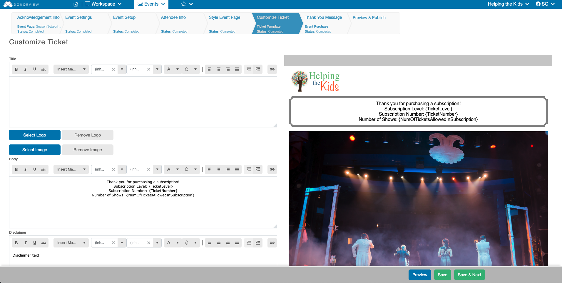 When finished editing the Thank You Email, click on Save & Close, then click Save and Next to publish the page. You are now ready to sell subscription passes. If you are using theater seating, refer to the next article “How do I assign subscriptions for seats?” for the next steps.