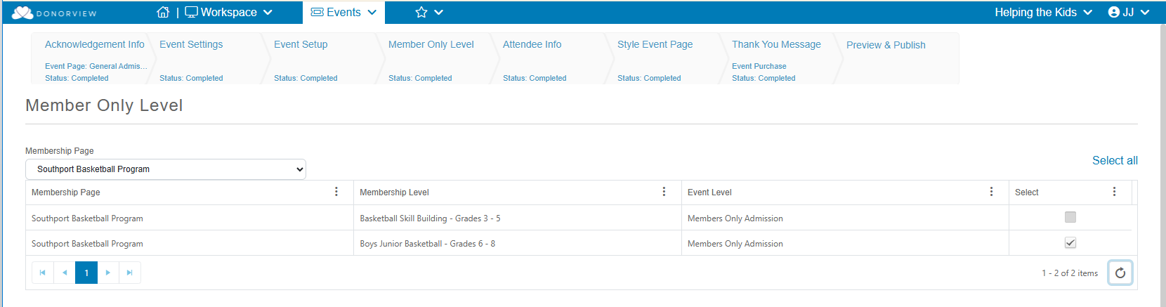 On the Member Only Level step, select the Membership Page and Membership Level(s) that apply to the Event Level by checking off the Select box or clicking Select All.