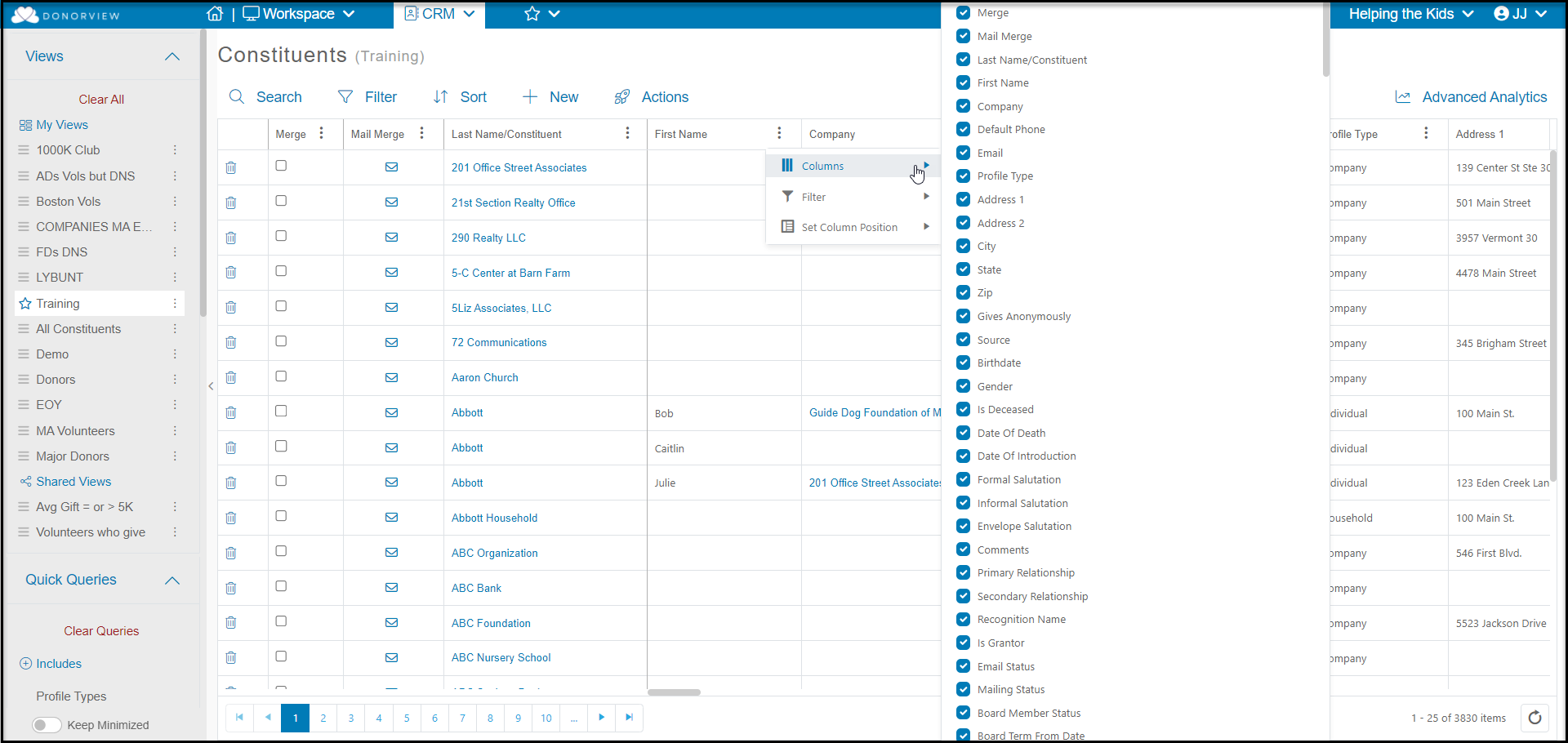Beyond those direct menus you can also use Edit Column Settings, which is accessed by clicking on the three dots that appear next to every column title on the grid. Edit Column Settings can apply filters to that specific column, hide or show columns, and lock a column to the left side of the grid. You can also drag and drop the column to a desired order and apply filters from the Quick Queries sidebar. Any views created using any combination of the Edit Column Settings, Quick Series sidebar, and top filter/sort menus can be saved into a single View.