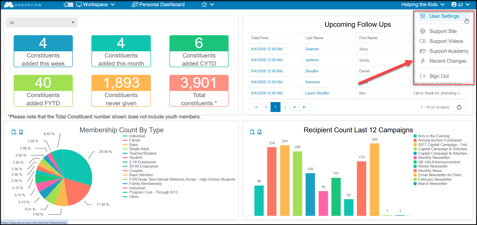 The support site links to the knowledge base with articles covering all the modules and activities in DonorView. New support tickets can also be generated from this link by clicking on “New support ticket.”