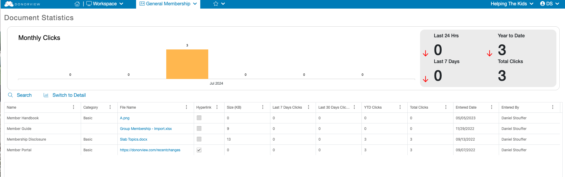 If you wish to see who is clicking on these documents you can click the “Switch to Detail” button. This will update the grid to show each individual document and hyperlink click along with the name of the member that clicked on it.