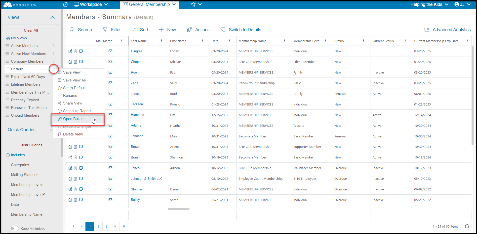 You can find many pre-made views in the View Builder library. You can find the View Library for a specific grid by clicking on the three dots next to any view, then clicking on Open Builder.
