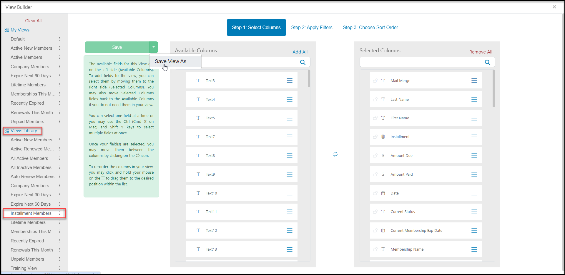 Click on the view you'd like to use then click the Save arrow, click Save View As, and you can rename the view as desired. You can modify the column arrangements, filters, and sorts as well. Close the builder by clicking on the small "x" in the upper right hand corner of the window.
