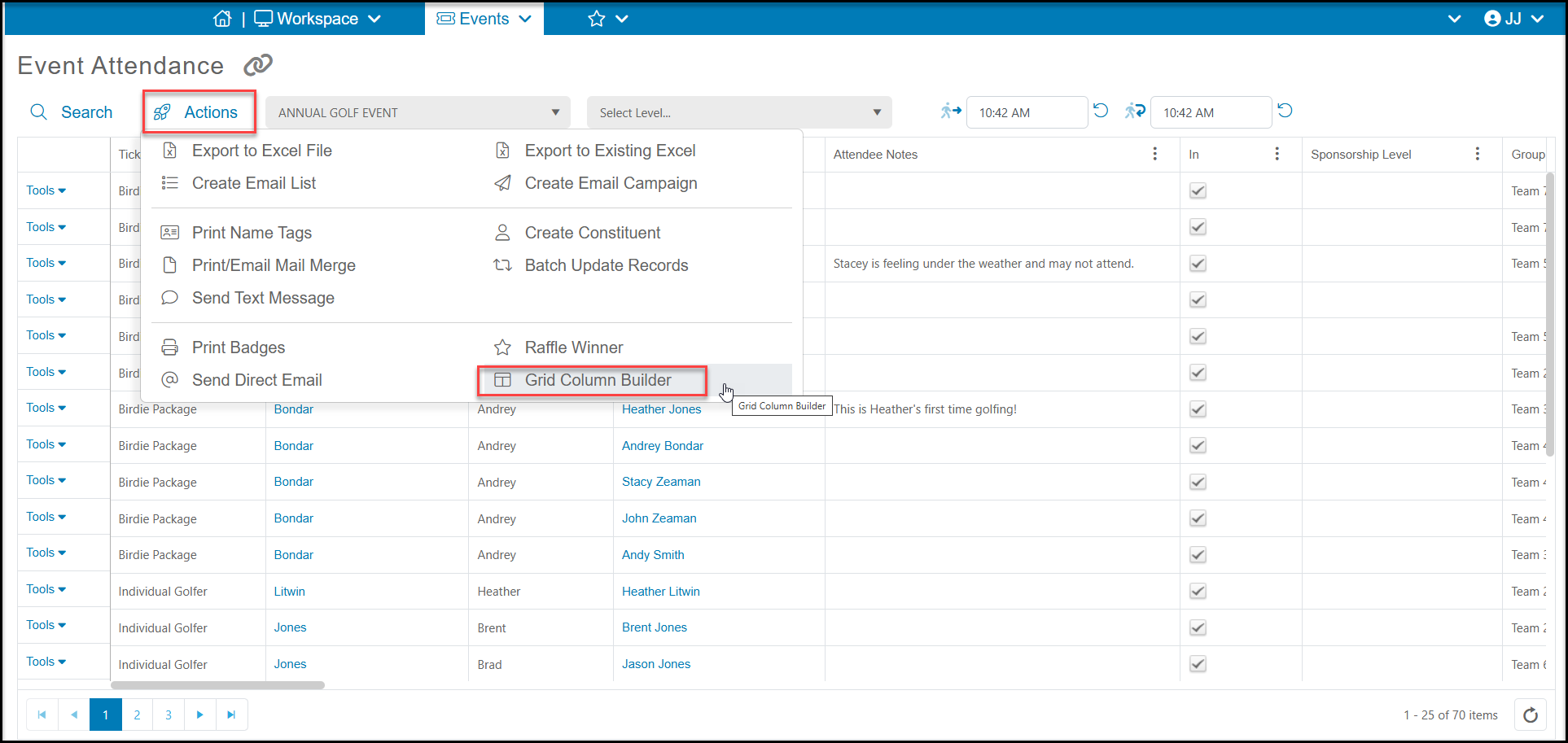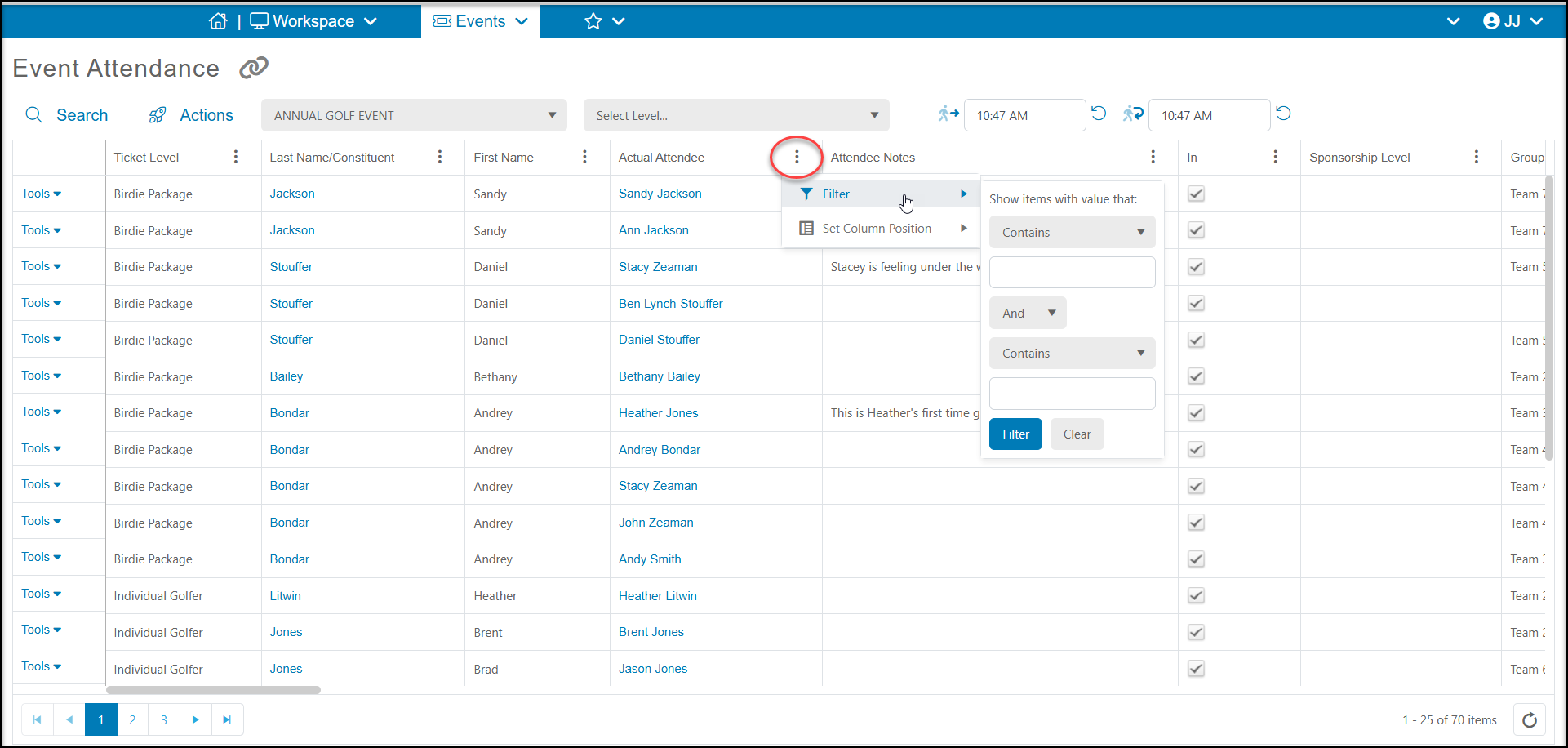 The Event Attendance grid works slightly differently than some of the other grids in the software as there is no option to save views for this grid, however, you can customize your view for each event. The views are user-specific, so each user can customize their own view for each event.