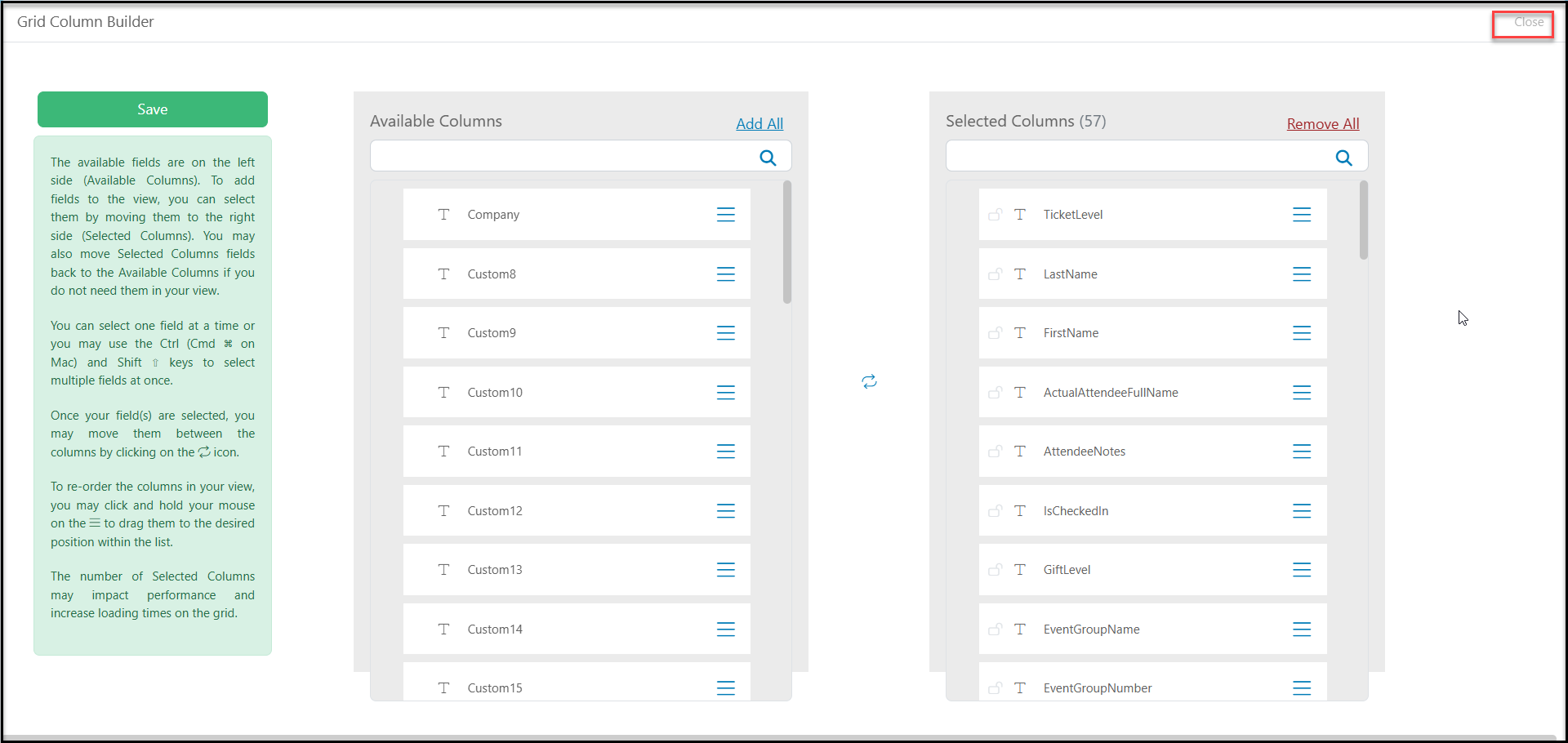 When you are finished selecting your columns, click on the green Save button. This will take you back to the grid. If you wish to close the Grid Column Builder without saving your changes, you can click on the Close link in the top right corner.