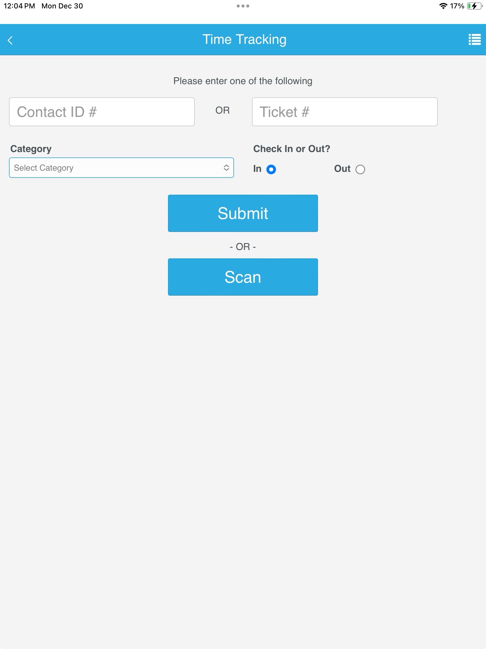 Volunteers can select the Category of work they are doing and select to Check In or Check out and click submit.