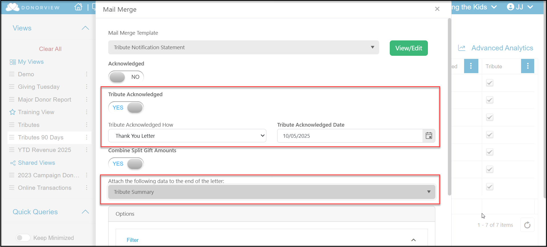 - Select Tribute Summary under Attach the following data to the end of the letter.