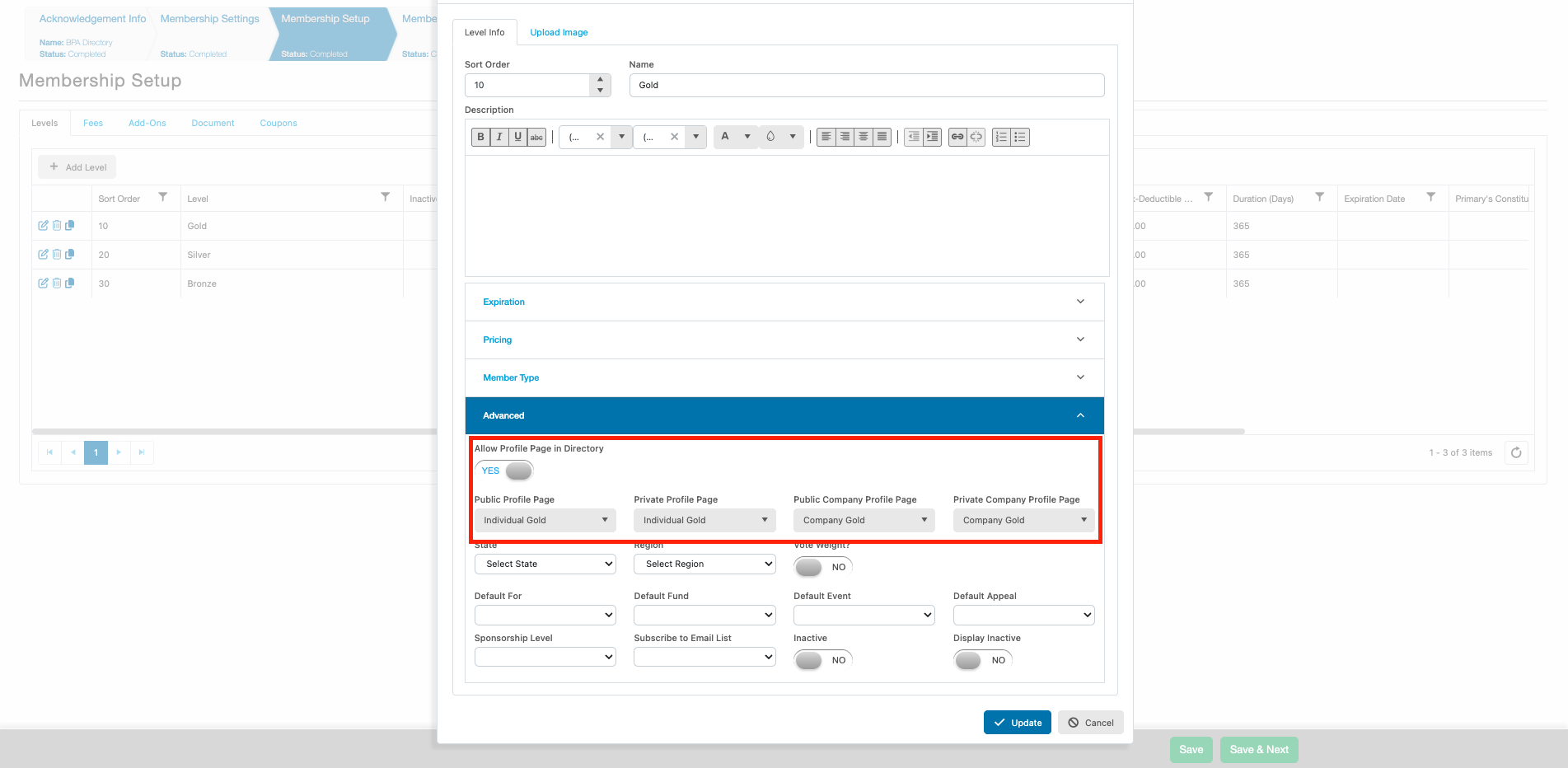 Click the blue “Update” button and repeat for other membership levels as needed.