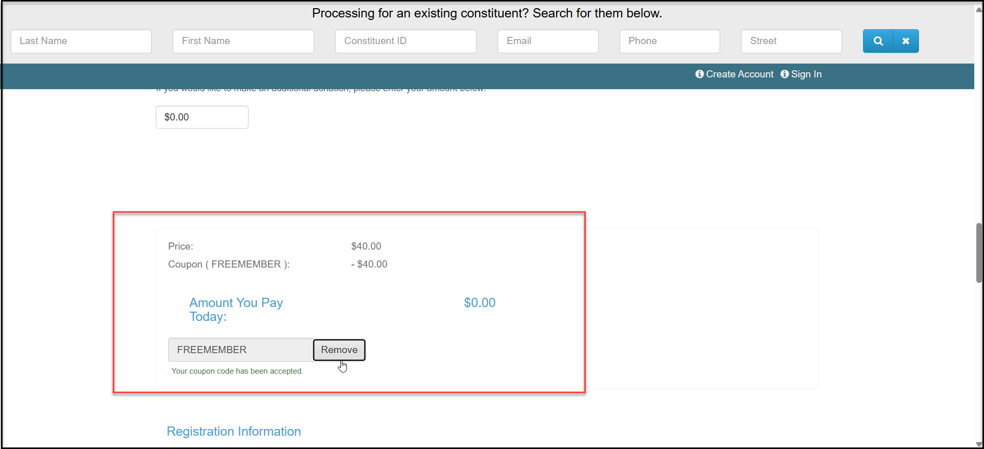 To use the coupon, the constituent or internal user would enter the code in the Coupon Code field on the membership page.