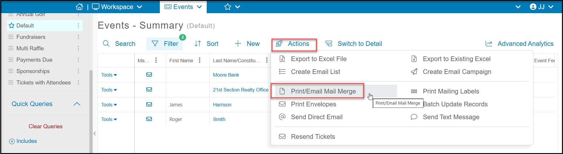 3. Once you have the list filtered, use the Actions menu and select Print/Email Mail Merge.