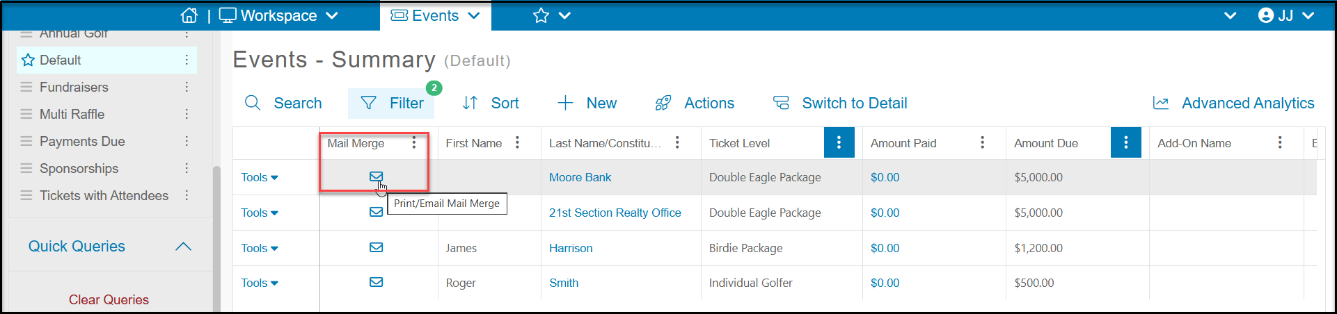 5. The Event Attendance grid does not have a Mail Merge envelope icon send option. You would need to filter the grid for the specific constituents to send a single letter.