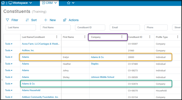 There is also a field associated with individual constituent records called Company (outlined in purple below.) This field represents the name of the company record that an individual record is related to with an employer-employee relationship. You can think of the Company field as employer. It will only show data when the name of the individual's employer is connected to their record. In the example below, Eralyn Adams works for Adams & Co (shown outlined in gold below.) Adams & Co. also have their own record in the database (shown outlined in green below.)