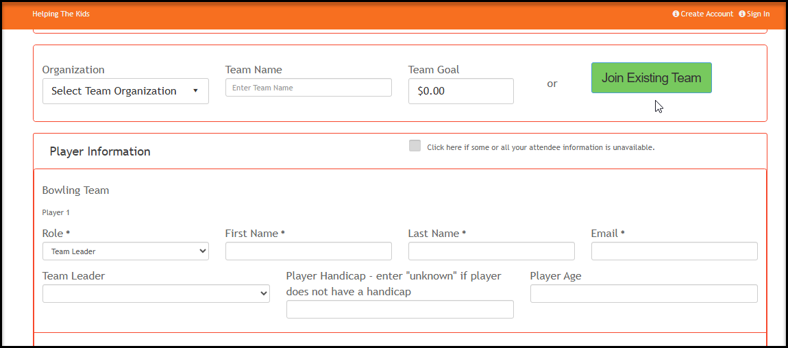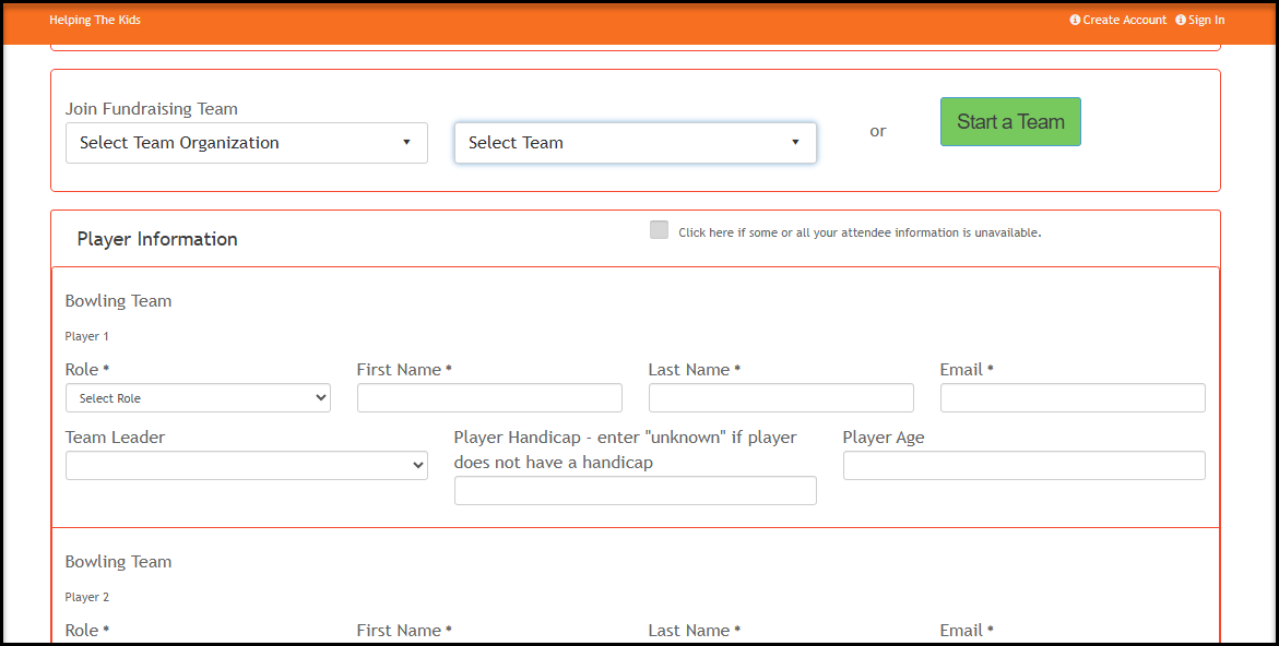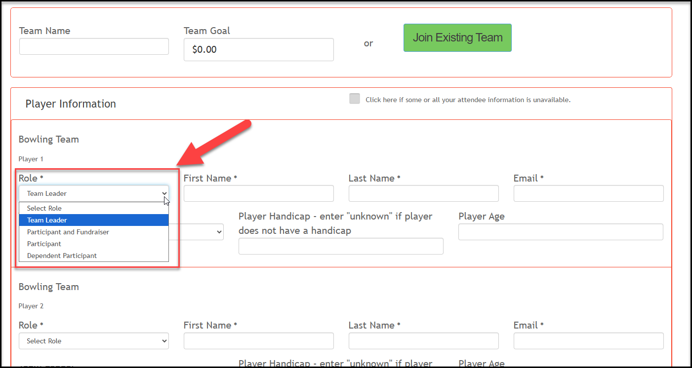 In the Attendee Information area (which we have renamed “Player Information” in our example) the registrant will enter the Role for each person who is participating.