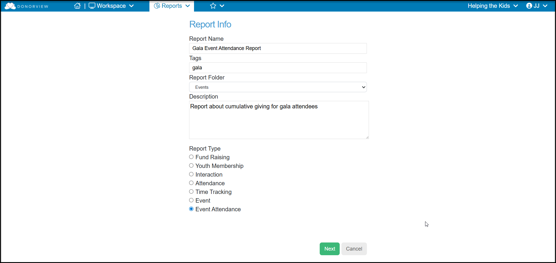 - Report Type - Choose Event Attendance to be able to cross reference the Events grid. Once selected and Next clicked, this cannot be changed.