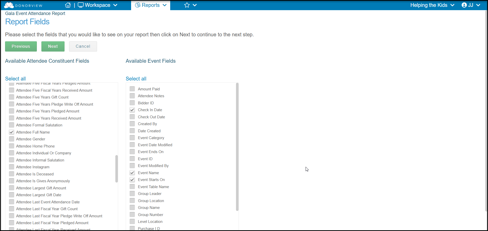 On the Report Fields page you will see two columns. On the left are all the columns available on your Constituents grid about the event attendees and the right are those available on the Event Attendance grid.