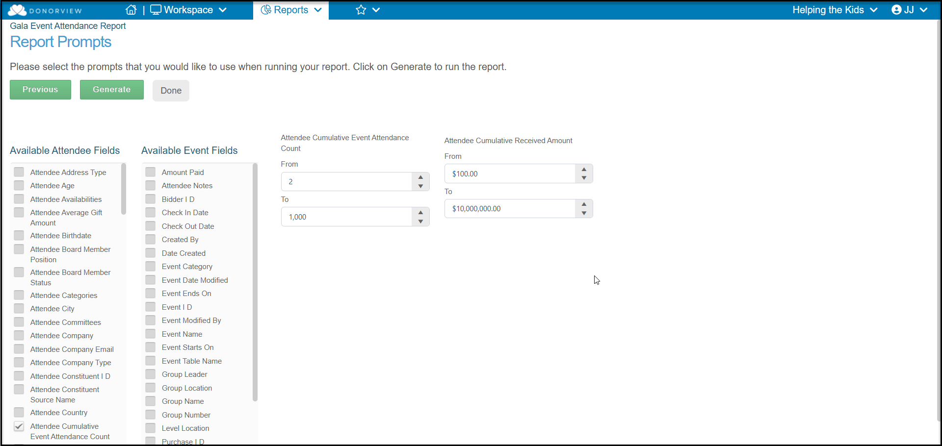 The prompts selected are performed in the order that they are assigned. So if you choose Cumulative Event Attendance first, the data will be filtered to meet the all the range you select, then the next prompt will be addressed. Only those event attendees who have attended at least two events would be included in the first filter, then only those who have also given over $100 would be included in the final report. These are also additive filters, so each additional prompt you select is an additional filter that must be met in order to be included in the report.