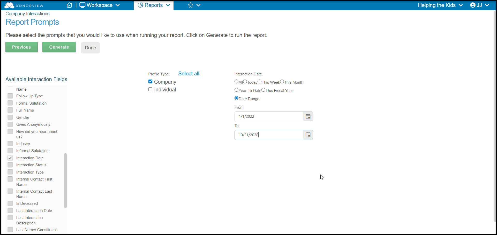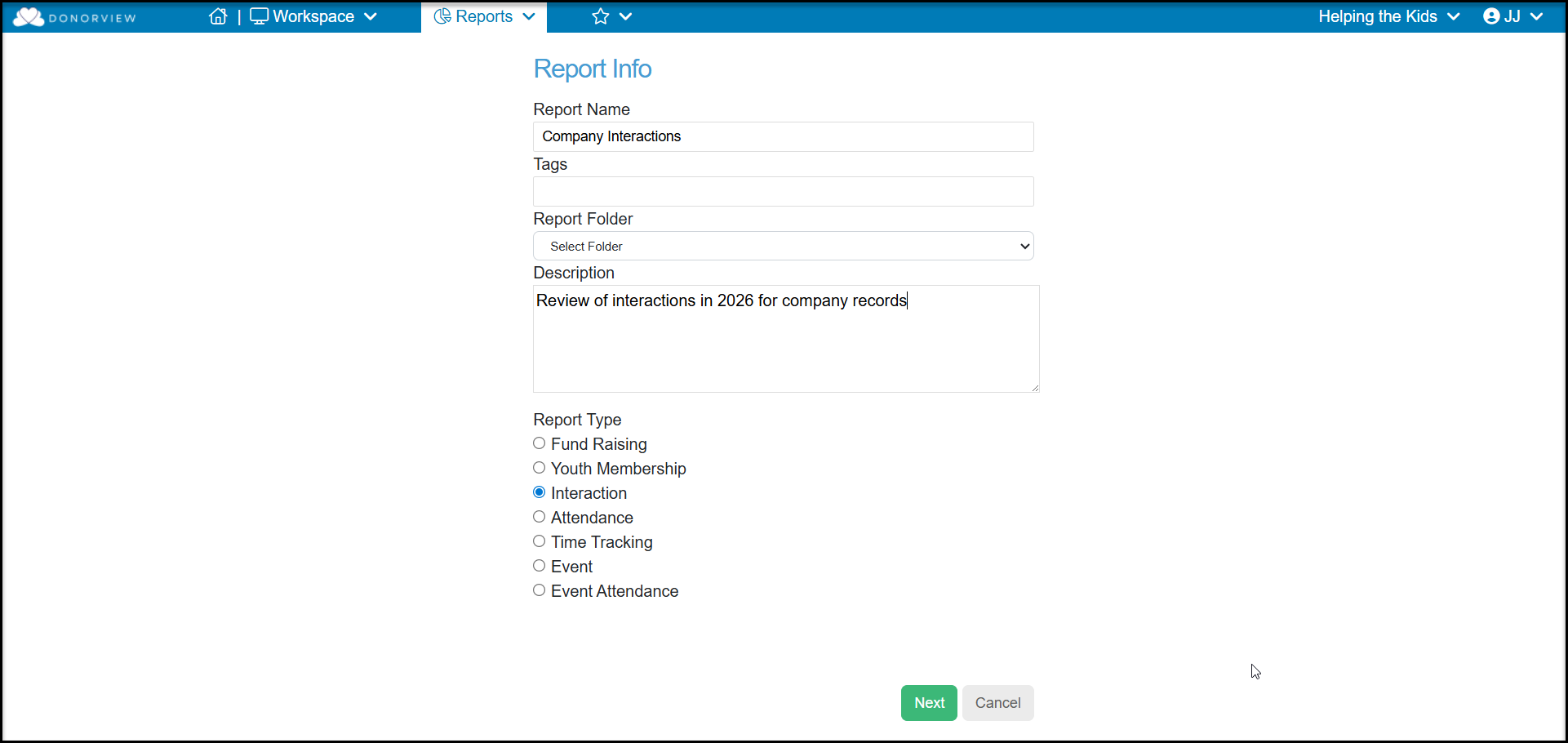 - Report Type - Choose Interactions to select fields and prompts from the Interactions grid only. Once selected and Next clicked, this cannot be changed.