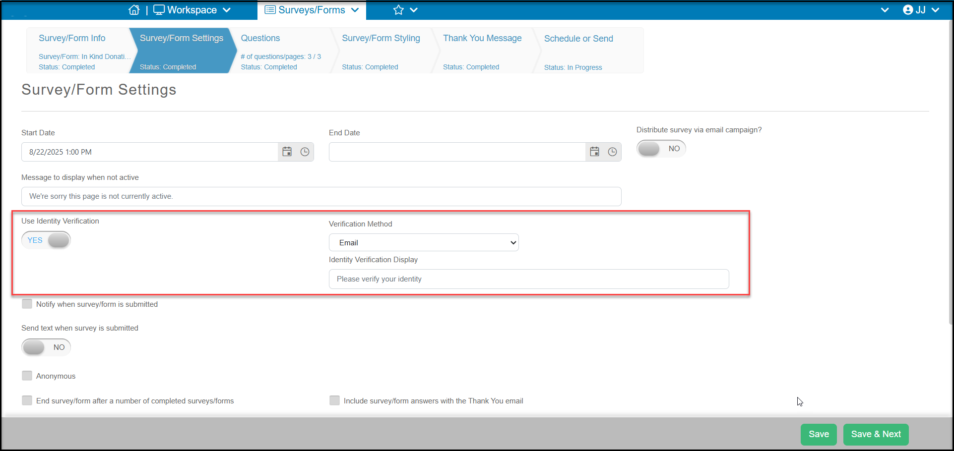 On the Survey/Form Settings tab, set Use Identity Verification to YES. This will reveal two new options: