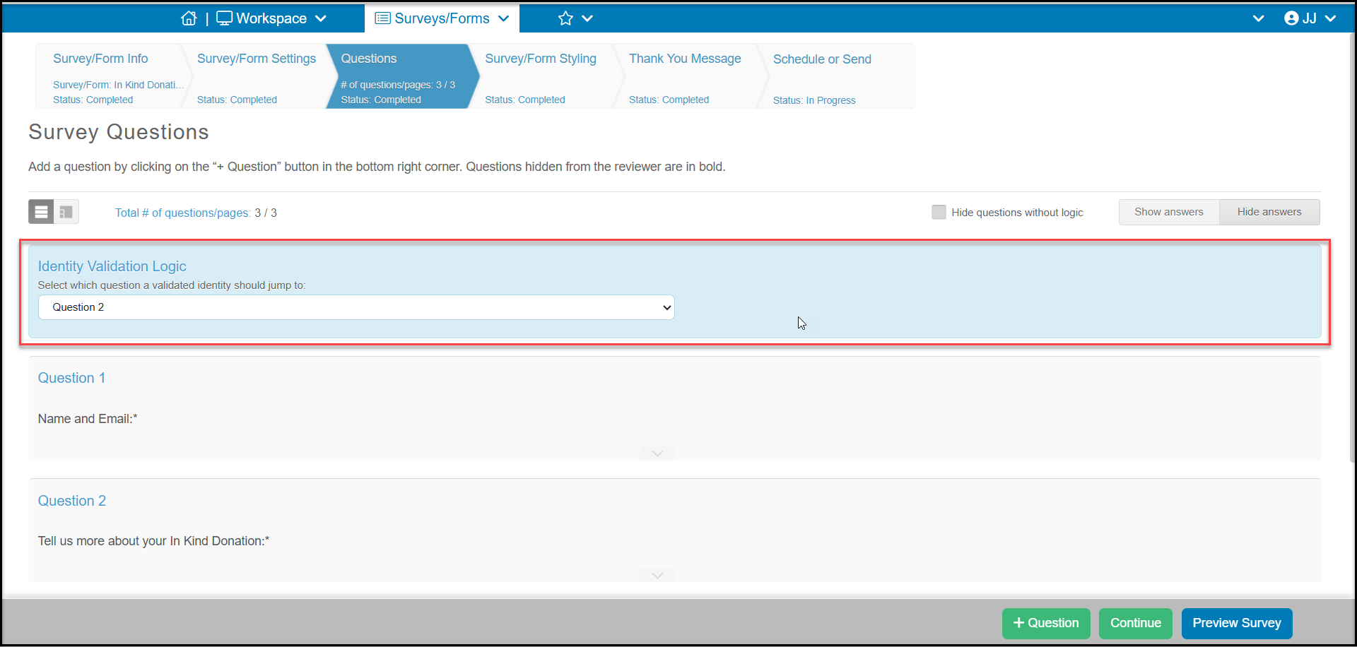 On the Questions tab, you will see a new Identity Validation Logic option. Here you can select which questions can be skipped if the software locates a matching constituent based on email or phone number.